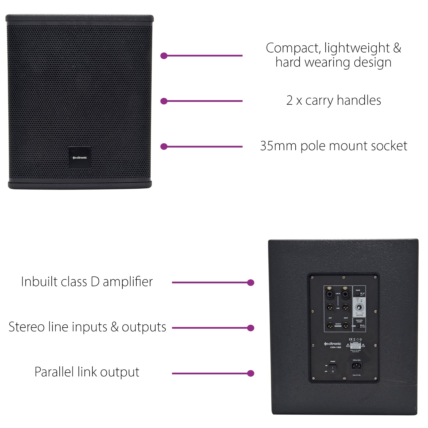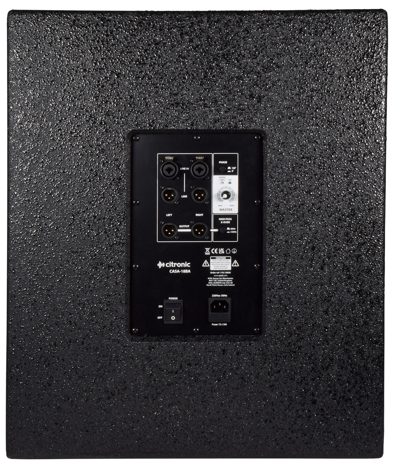 Lightweight yet powerful active subwoofer units with inbuilt class D amplifiers. Each cabinet is constructed from 15mm MDF with integral side handles for easy portability and a 35mm socket to accommodate a mounting pole. The high-flex sub-driver is front-loaded with a protective steel grille to deliver powerful transients and add warmth to any sound system. The class D amplifier section has stereo line inputs and outputs to allow use either as a mono sub with stereo tops or a matching sub for each top speaker. Line inputs have a parallel Link output to pass the signal onto further active speakers and a pair of line outputs with a switchable high pass filter to connect to active top cabinets. A phase switch is included to help avoid sound cancellation and time-aligned multiple-speaker setups. Designed as a perfect match for the CASA series speakers and is equally at home with other active full-range cabinets.