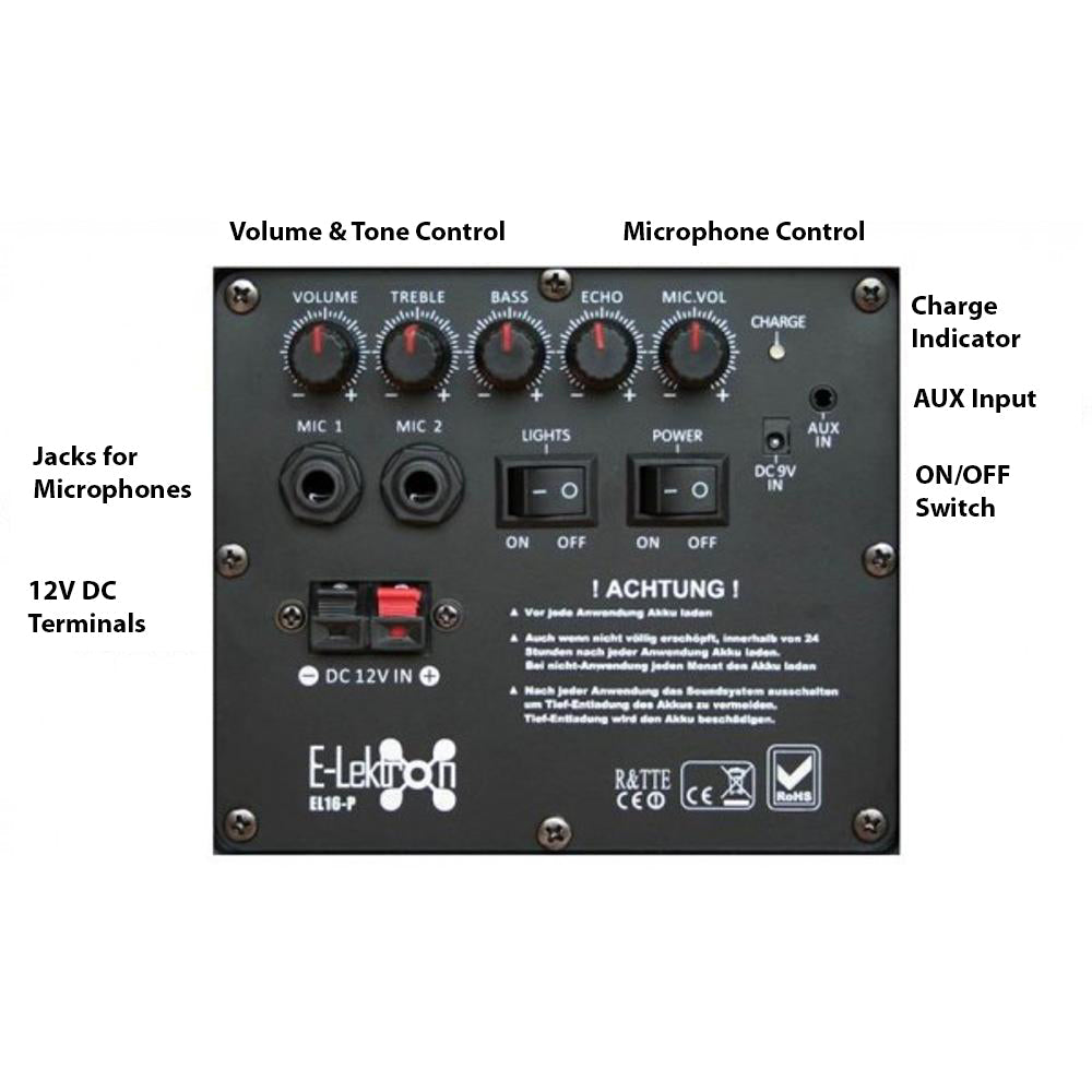 E-Lektron EL-16P Portable Bluetooth Speaker with USB/SD/MP3 Rechargeable Battery Wireless Microphone FM Radio Remote Control LED Lighting Sound Equalization