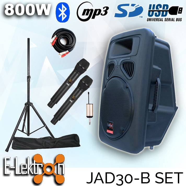 The E-Lektron JAD30U2 is a karaoke PA Speaker Set that comes with one 800W 12inch active speaker, 2 tuneable UHF wireless microphones and speaker stand. It is specially designed for home and small party karaoke.