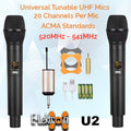 The microphone set with 2 high-quality UHF wireless microphones and a plug-on receiver that can be connected directly to the mixer, amplifier, or sound system. The receiver is equipped with a rechargeable battery and can thus operate independently of the mains for up to 4 hours.