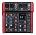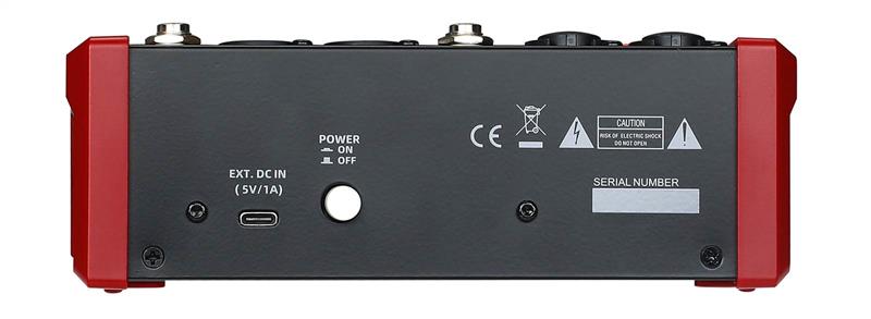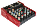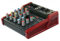 Compact audio mixer with options for 2 mono + 2 Stereo input channels, plus a minijack stereo input. Each mono channel has a combo XLR/jack input with switchable +48V phantom power in pairs for XLR inputs.