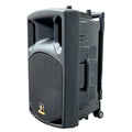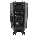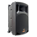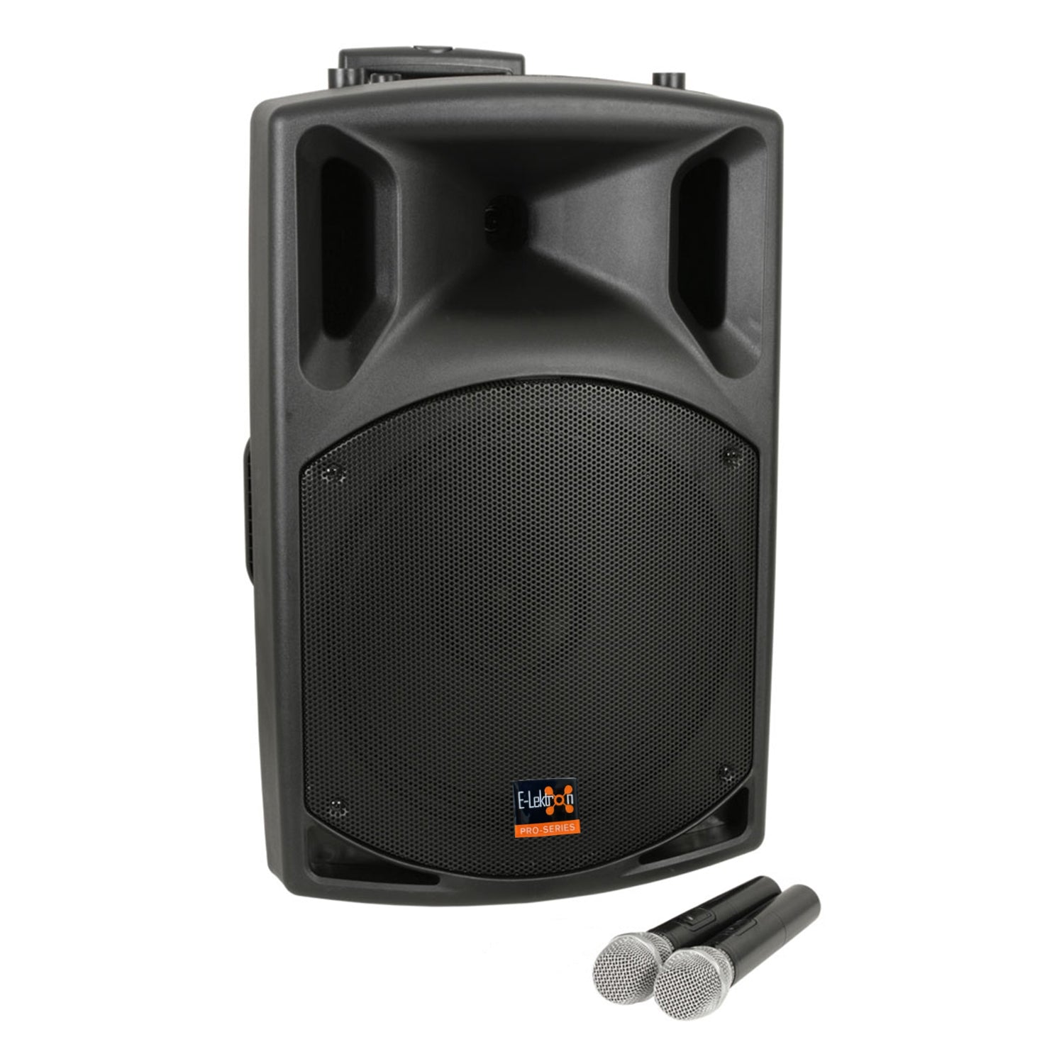 E-Lektron UHF38-MS 1800W 15" inch portable speaker set with stands are powerful, Bluetooth linkable 2-way PA sound system with a built-in power amplifier that is shockproof, designed as a roll case ABS plastic housing with handle and wheels.